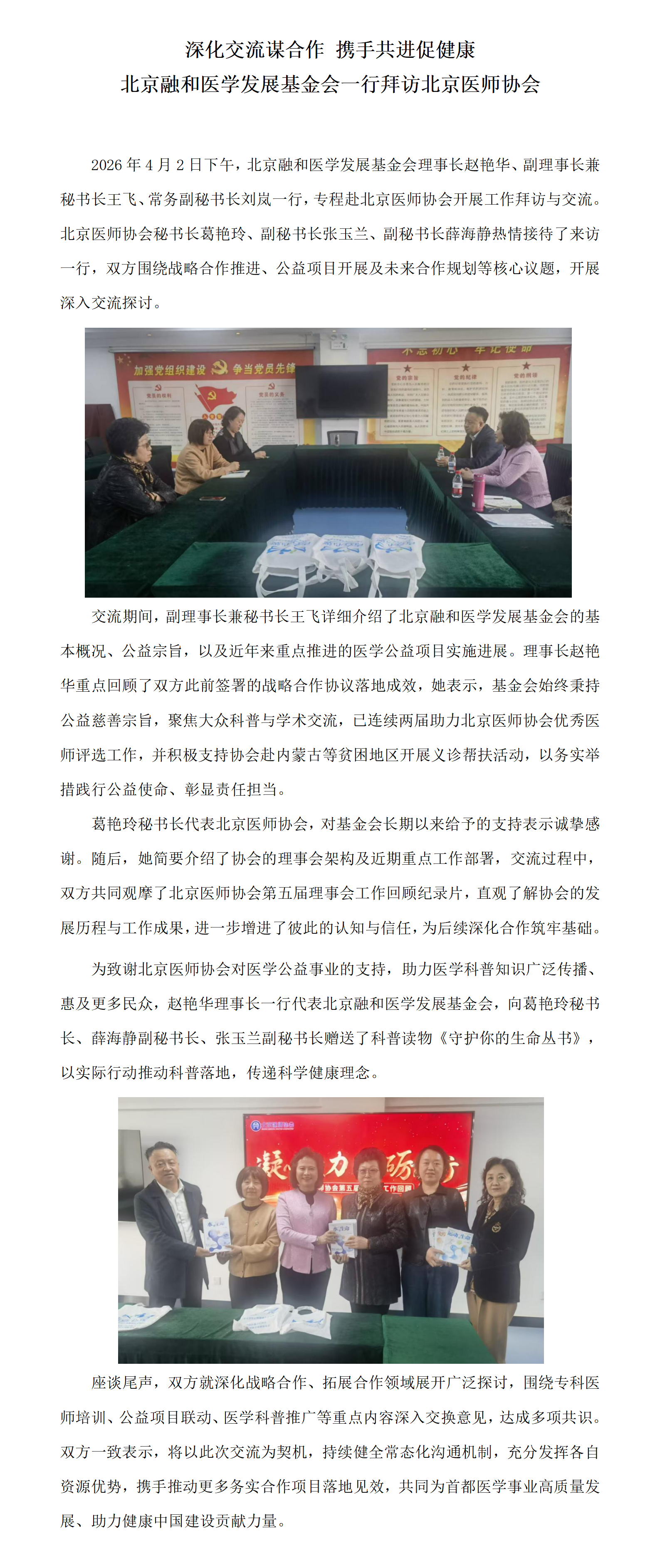 深化交流谋合作 携手共进促健康 北京融和医学发展基金会一行拜访北京医师协会