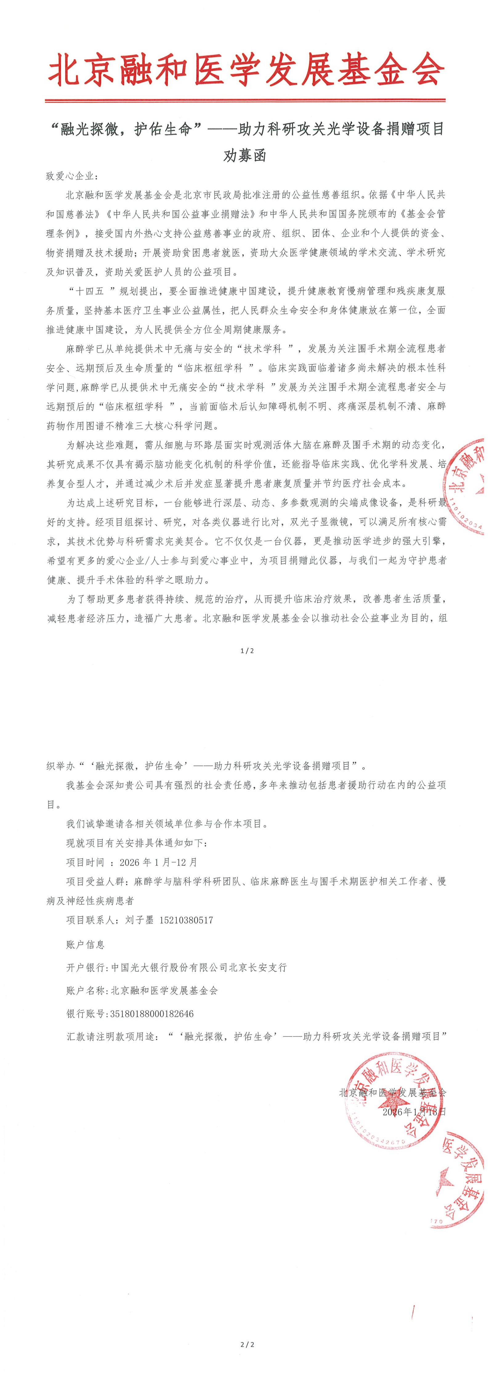 “融光探微,护佑生命”——助力科研攻关光学设备捐赠项目 劝募函