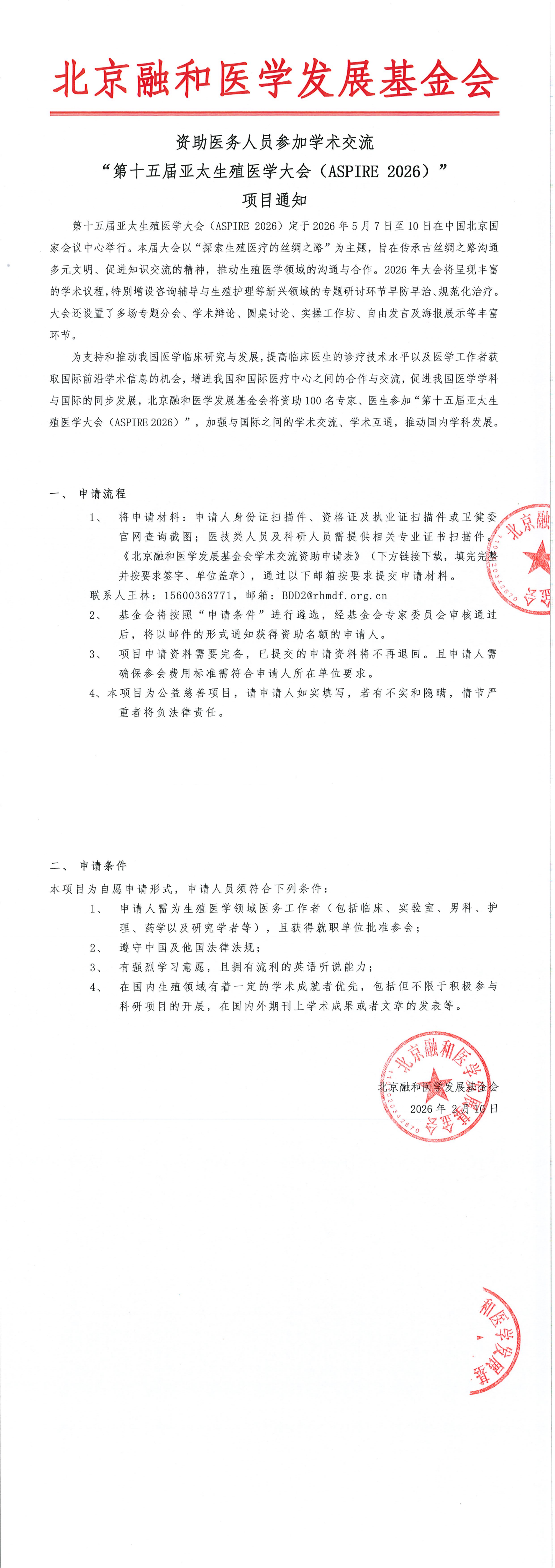 资助医务人员学术交流-“第十五届亚太生殖医学大会(ASPIRE 2026)” 项目通知