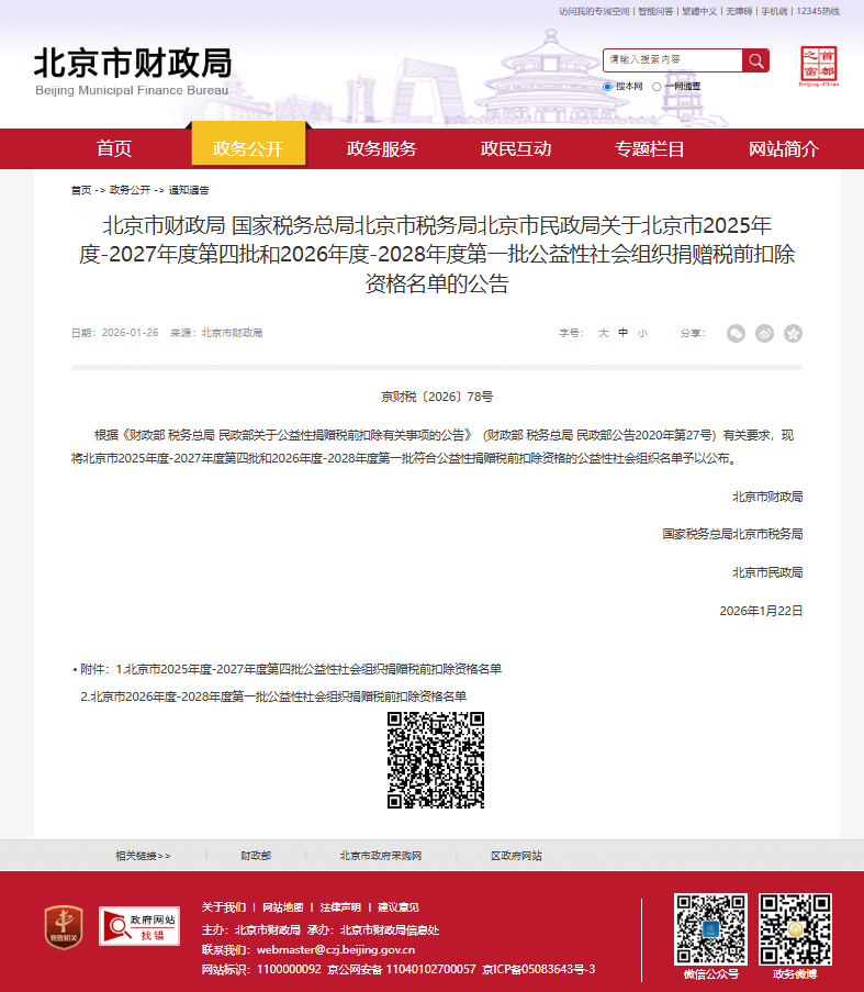 北京市2026年度-2028年度第一批公益性社会组织捐赠税前扣除资格名单 2026-01-28